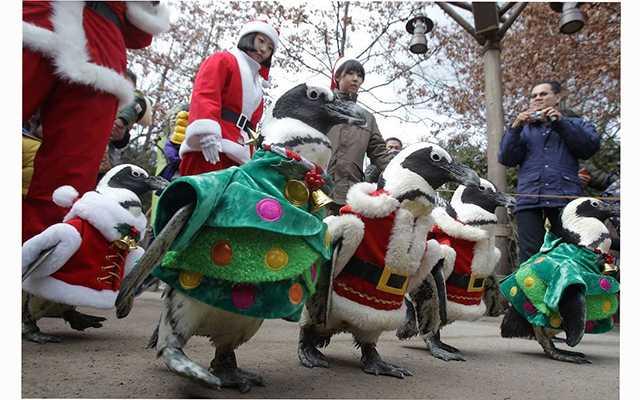 Парк развлечений Everlamd в Южной Корее устроил парад пингвинов, одетых в костюмы Санта Клауса и рождественских елок.