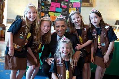 В интернет попала фотография, на которой президент США Барак Обама позирует в короне. Детскую диадему он надел на голову, чтобы сфотографироваться с группой девочек-скаутов в городе Талса (штат Оклахома), пишет Politico.
