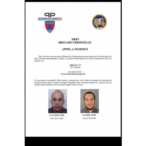 Речь идет о 34-летнем Саиде Кауши и его 32-летнем брате Шерифе. Оба они родились в Париже в семье алжирского происхождения. Стражи порядка обратились к свидетелям с просьбой помочь следствию, предупредив, что разыскиваемые "скорее всего вооружены и опасны".