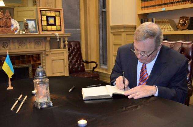 Американский сенатор-демократ Дик Дурбин посетил Генеральное консульство Украины в Чикаго, чтобы сделать запись в книге соболезнований по жертвам обстрела автобуса под Волновахой.