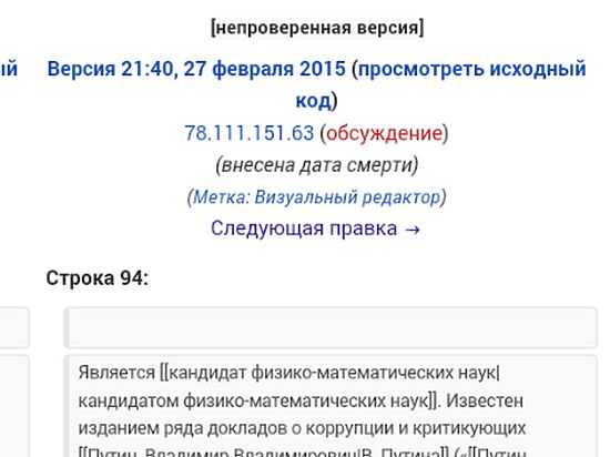 «Убит 27 февраля 2015 года в г. Москва» — говорится в статье. И чуть позже: «Дата смерти = 27/02/2015 в 23;40 застрелен» — такая правка была внесена в статью о политике в 21:40 по Москве. Первые сообщения об убийстве начали появляться в районе полуночи. Само покушение произошло около половины двенадцатого ночи.
