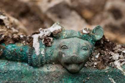 Так, в гробнице найден огромный бронзовый котел диаметром около метра. Он имеет четыре ручки с головами греческого речного бога Ахелоя. Другие украшения, например головы львиц, расположены по краям сосуда. Внутри котла археологи нашли керамический сосуд для вина с изображениями бога Диониса, лежащего под лозой перед женщиной.