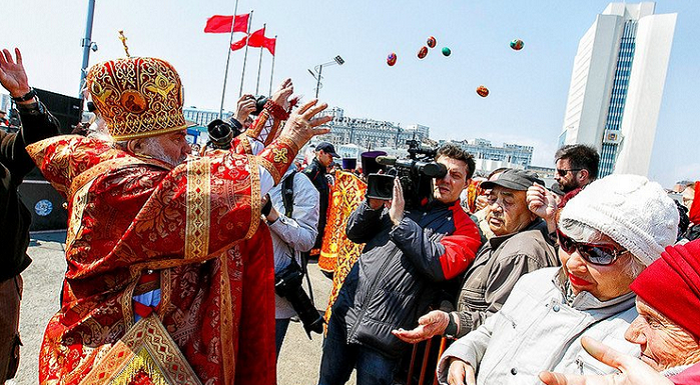 Согласно задумке организаторов, по центральным улицам города должен был пройти Крестный ход. Тысячи жителей и гостей приморской столицы прошли по Океанскому проспекту до центральной площади, где остановились у стен строящегося Спасо-Преображенского кафедрального собора. После молитвы и освящения, глава местной религиозной общины начал бросать в собравшуюся толпу прихожан крашенные пасхальные яйца. Это вызвало небывалый ажиотаж среди верующих. Люди стояли за металлическим забором, который обрамлял центральную площадку с церковнослужителями. После того, как яйца полетели в толпу, среди людей началась давка – каждый из присутствующих спешил первым ухватить «освященное» угощение на память. Со стороны такой «народный экстрим» выглядел не совсем привлекательно.