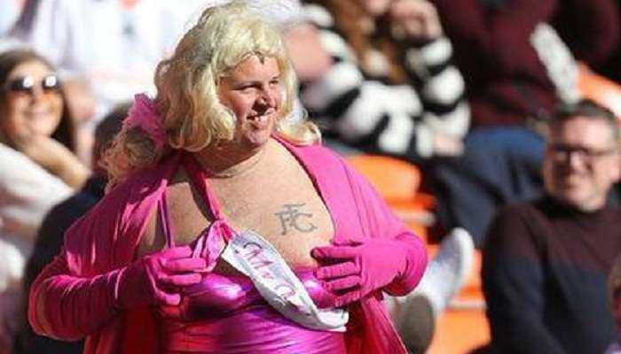 В Британии на футбольном матче между командами «Блэкпул» и «Фулхэм» один из болельщиков изрядно удивил футболистов и зрителей своей выходкой. Так, совершенно неожиданно мужчина выбежал на поле в розовом платье и парике.