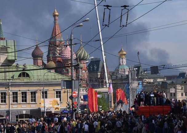 Дым настолько густой, что его видно даже на Красной площади возле Кремля, где сейчас проходит парад Победы.