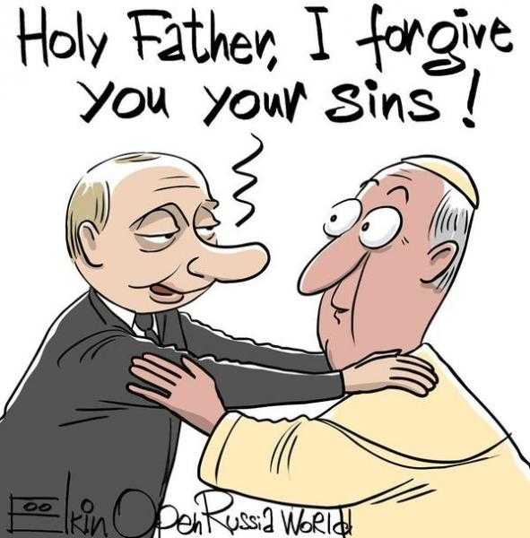 Об этом Президент России сказал итальянским журналистам во время своего визита в Ватикан, где у него, среди прочего, назначена встреча с Папой Римским Франциском, сообщает у себя в Twitter известный карикатурист Сергей Елкин.