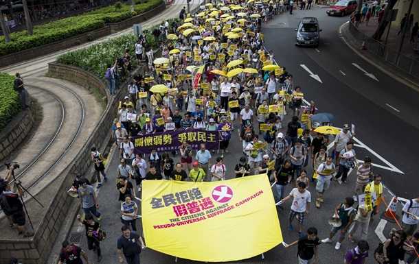 Активисты с желтыми зонтиками призывают наложить вето на закон, по которому жители Гонконга смогут самостоятельно голосовать на выборах главы администрации при условии, что кандидаты на этих выборах одобрены материковым Китаем.