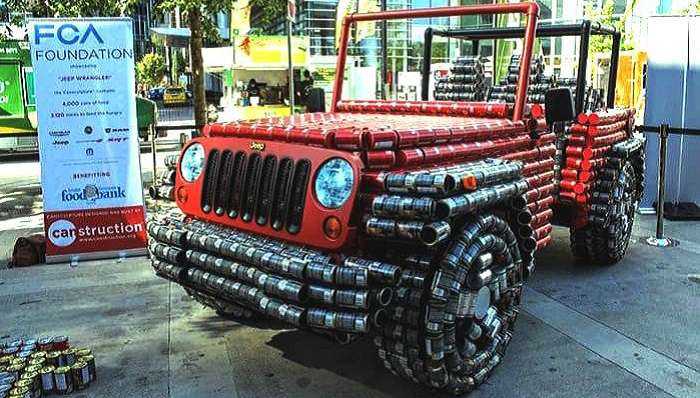 Внедорожник составлен из 4500 консервных банок, а установили его на набережной Ванкувера. Самое интересное то, что консервные банки не пустые, в них до сих пор есть пища, которой еще далеко до окончания годности.