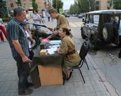 Под звуки военных и патриотических песен жителям Волгограда и гостям города было предложено заполнить мобилизационное предписание, записавшись в «добровольцы» на защиту Сталинграда.