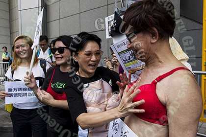 Около 200 человек, одетых в лифчики, собрались на митинг против приговора женщине, осужденной за толчок полицейского грудью. Акция прошла около штаб-квартиры полиции в гонконгском районе Ваньчай. Об этом сообщает The South China Morning Post.