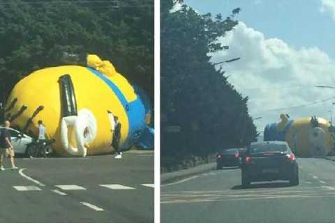 Огромный 33-метровый надувной миньон устроил настоящее ДТП в Северном городе Дублине, район (Сантри). Ветром его отнесло на проезжую часть, что и преградило движение на дороге, передает Газета.ua.