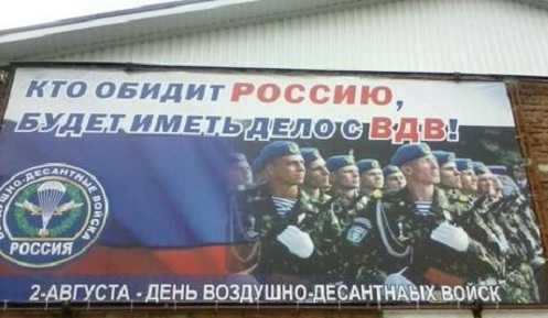 Сам лозунг плаката гласит, «Кто обидит Россию, будет иметь дело с ВДВ!».