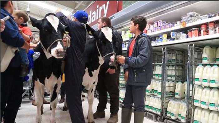 Из-за низких цен на молочную продукцию, фермеры британского графства Стаффордшир привели в супермаркет коров. Таким образом они выразили свой протест против низкой цены молока.