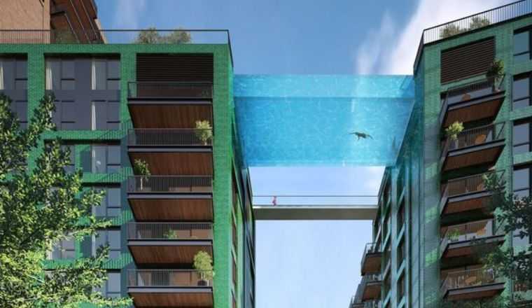 Потрясающий бассейн расположен на уровне 10-ого этажа зданий. Расположено сооружение в новом районе столицы Великобритании. Бассейн полностью прозрачный. Конструкция имеет 25 метров в длину, 5 метров в ширину и от 1,2 до 3 метров в глубину. Захватывающее место с чудесным названием «Небесный бассейн» — действительно самый удивительный аквариум в мире. Он удивляет каждого, кто к нему приближается.