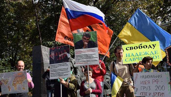 Россияне, которые вышли на акцию, держали украинские и российские флаги и плакаты, тексты которых осуждали арест украинского режиссера Олега Сенцова, убийство оппозиционера Бориса Немцова, незаконное содержание в плену украинки Надежды Савченко.