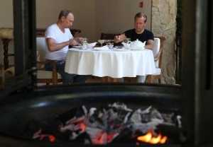 Президент России Владимир Путин и премьер-министр Дмитрий Медведев вместе позанимались в спортзале, а потом перекусили в это воскресное утро.