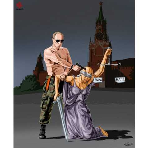 Художник Гюндуз Агаев нарисовал серию сатирических работ под названием Femidead, посвященную правам человека и справедливости. На картинах показано, как в разных странах издеваются над Фемидой – богиней правосудия. Персонажем одной из картин стал Владимир Путин – президент РФ с голым торсом на Красной площади держит пистолет у виска Фемиды, на весах богини написано "Крым наш".