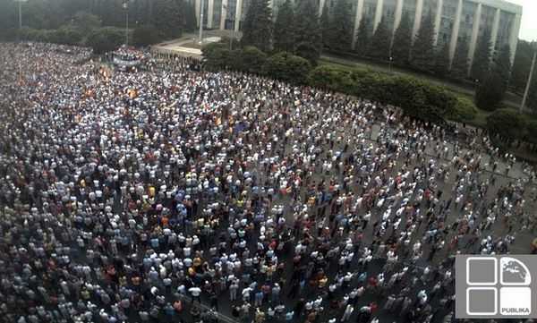 Активисты стекаются на площадь с транспарантами, флагами Румынии, Молдовы и ЕС. По различным оценкам, в акции принимают участие от 20 до 50 тыс. человек.