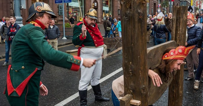 Вчера российская столица отметила День города, в рамках которого прошло около 500 мероприятий. Особый интерес вызвал аттракцион, во время которого девушку, одетую в российский кокошник и распятую на дыбе, били розгами мужчины, переодетые в форму германской армии времен Первой мировой войны.