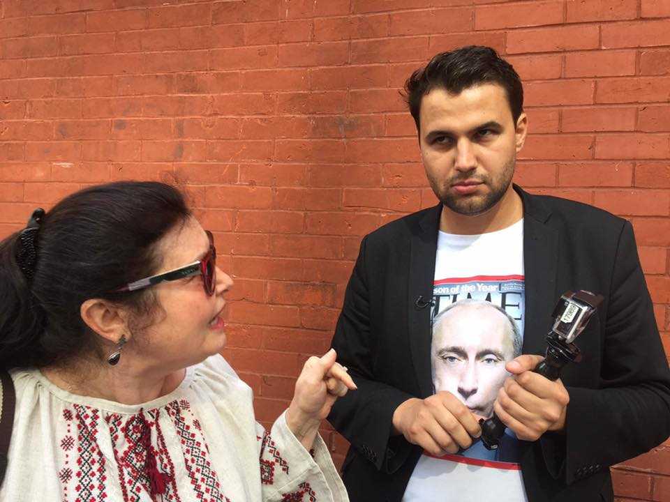 Провокатор гулял по улицам Нью-Йорка в футболке с «человеком года». Реакция людей была неоднозначной. Тогда «журналист» делегирован на задачи от российского телеканала НТВ пошел на митинг против Путина и агрессии РФ. Примечательно, что там его встречали без аплодисментов и особых привилегий. Мужчина тем временем провоцировал людей вопросами типа «Чем вам лично навредил Путин?». Реакция людей, в основном этнических украинцев, была агрессивной. Снятые на скрытую камеру ответы участников митинга впоследствии стали основным аргументом «дебильности украинцев». На днях смонтирована программа «Пропаганда» вышла на российские экраны.