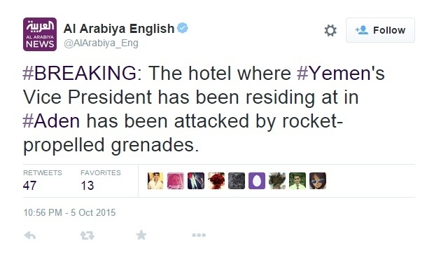 Вице-президент Йемена, вернувшись в Аден после его освобождения от повстанцев-хуситов в середине сентября, проживает в отеле «Аль-Каср». В это же время из Саудовской Аравии вернулся и президент Абед Раббо Мансур Хади.