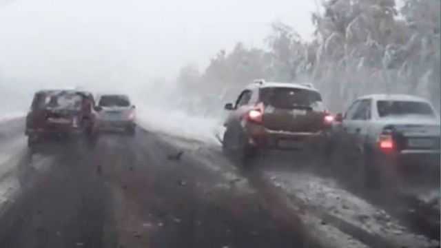 Сразу в нескольких регионах России сегодня погода объявила так называемый день жестянщика. Неожиданный снегопад превратил дороги в настоящие катки.