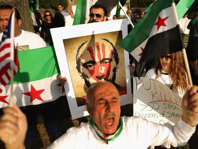Накануне, 9 октября, около сотни человек вышли под стены Посольства Российской Федерации в Вашингтоне , требуя от Москвы прекратить бомбардировки Сирии.