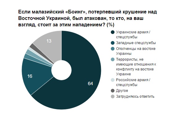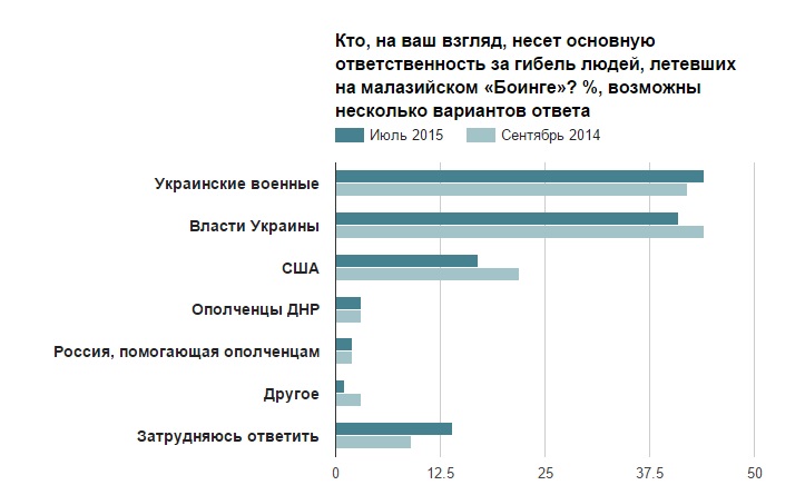 Еще 17% возложили ответственность на США. Об ответственности ополченцев ДНР сказали лишь 3%, о России заявили 2%. Год назад похожие ответы дали респонденты ВЦИОМа: 64% (от числа информированных о катастрофе) сказали, что за атакой на Boeing стоят украинская армия и спецслужбы, 16% предположили, что речь идет о западных спецслужбах, 2% назвали ополченцев народных республик востока страны, а 1% сочли виновными российскую армию и спецслужбы.