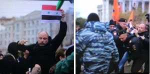 Рогов заявил: "Как сопредседатель общества дружбы "Новороссия-Сирия" приехал поддержать сирийский народ. Попросил слова, но мне его не дали. Мало того - напали и попытались избить". Это случилось после того, как активисты увидели в руках Рогова флаг Сирии.
