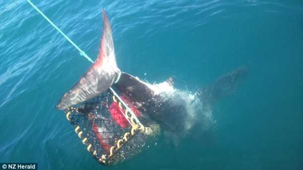 Большая белая акула попалась в ловушку для раков между островом Бэр и пляжем Уэймарама, расположенном в 21 километре от города Хавлок-Норт (Новая Зеландия).