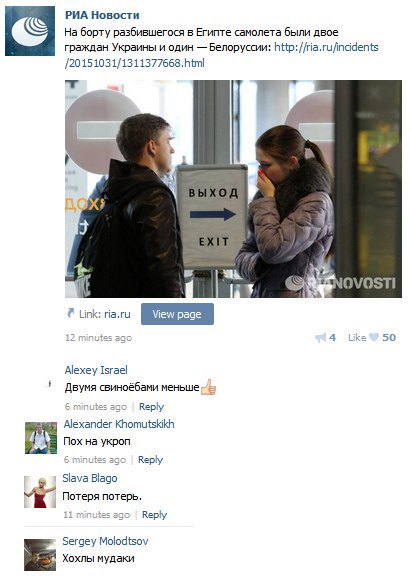 В одном из российских пабликов подписчики мягко говоря бесчувственно отреагировали на сообщении о гибели украинцев в авиакатастрофе в Египте.