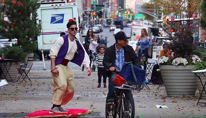 Мужчина в костюме Аладдина стал фаворитом жителей Нью-Йорка. Во время праздника Хэллоуина он не просто разгуливал по городу, он еще и летал на ковре, как настоящий герой мультфильма про Аладдина.