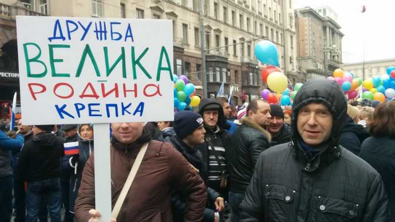 На плакатах и транспарантах не упоминается российская военная операция в Сирии.