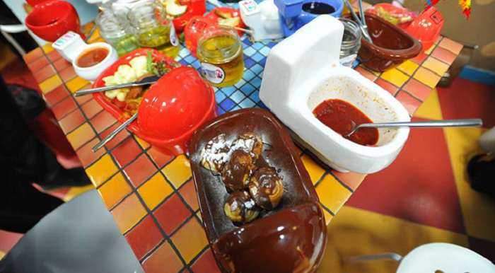 Стены заведения украшены рисунками, которые являются мини-иллюстрациями о приключениях .. дерьма! Так, можно посмотреть на дерьмо в космосе, дерьмо с крылышками ангела и дерьмо на конвейере. Под стенами стоят металлические ночные горшки. Клиенты сидят не на стульях, а на унитазах. Более того, они едят из посуды в форме унитазов. И, якобы привычные обычному человеку блюда, поданные в форме результатов пищеварения...
