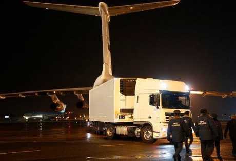 Спецборт МЧС России ИЛ-76 прибывает в аэропорт Пулково. Под покровом темноты останки людей "валетом" и горой погружены в два больших рефрижератора - "классические" белые КамАЗы, снятые с "Гумконвоя" российских государственных мародеров на Донбассе. Опознание проходит в крематории на Шафировском проспекте.