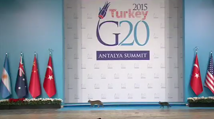 Пока сцена проходящего в турецкой Анталье саммита "группы двадцати" пустовала, три кошки решили развлечь заскучавших зрителей и журналистов и поочередно вышли из-за кулис. Сие действо было заснято репортерами из многих стран и в одночасье обрело бешеную популярность в интернете.