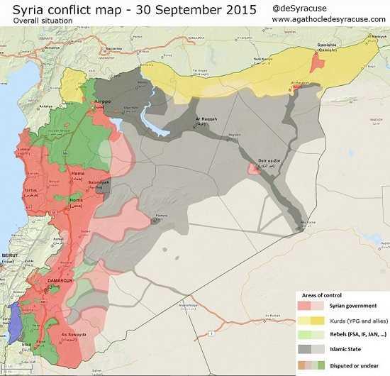Основные позиции сил ВС РФ, поддерживающих сирийского лидера Башара Асада в борьбе против террористов "Исламского государства", на данный момент сосредоточены в нескольких регионах (отмечены зеленым): Дамаск (авиабаза), Латакия (авиабаза), Тартус и Хомс, Бассель Аль-Сад (авиабаза) и Слинхаф. Параллельно с российской армией, среди иностранных контингентов на территории, подконтрольной Сирии находятся базы иранских вооруженных сил.