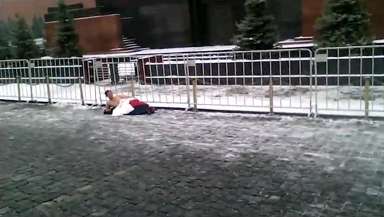 Отмечается, что этот гражданин уже проводил одиночную акцию у Государственной Думы, требуя у правительства выдачи ему квартиры. Сегодня москвичи, решившие прогуляться по Красной площади, стали свидетелями странного инцидента. У мавзолея Ленина на брусчатке лежал обнаженный мужчина и выкрикивал лозунги «Ленин, поделись жильем».