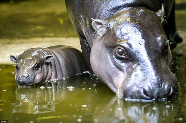 Бристольский зоопарк впервые показал детеныша редчайшего либерийского карликового бегемота. Пока он не имеет клички и все время проводит с мамой Сираной.