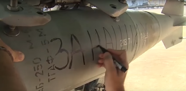 20 ноября Министерство обороны России обнародовало видеоролик, на котором показано, как летчики и техперсонал авиабазы «Хмеймим» маркерами наносят на авиабомбы надписи «За наших» и «За Париж».