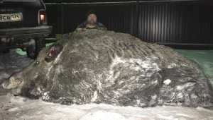 По словам охотника, размеры кабаны настолько гигантские, что его не удалось погрузить в машину – тушу пришлось прицепить тросом к авто и волочить за собой.
