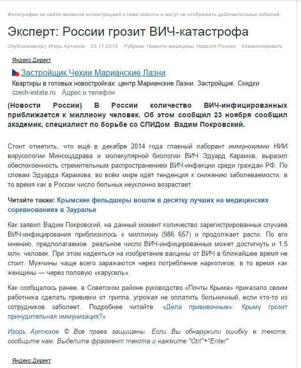 Покровский отметил, что, несмотря на то, что число ВИЧ-позитивных в РФ приблизилось к миллиону, показатели все время изменяются в сторону увеличения. Не исключено, что вскоре число болеющих людей может перевалить за 1,5 миллиона человек. При этом надеяться на изобретение вакцины от ВИЧ в ближайшее время не стоит.
