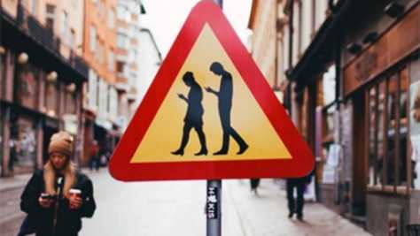 В Финляндии появился новый дорожный знак с надписью Mobile people, изображающий желто-красный треугольник и фигуры людей, шагающие с телефоном в руках.