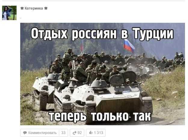 Такие картинки практически вытеснили привычные для сетей изображения с котиками и смеющимися детьми. При этом за последнее время список "врагов" России увеличился. В списке уже давно были США, страны Евросоюза, Великобритания и Украина теперь добавились сирийские повстанцы (умеренная оппозиция), ИГИЛ и Турция. Для каждого из государств подобраны свои уникальные оскорбления, хотя некоторые из них перекликаются. Так например американцы — обязательно тупые, все европейцы — геи и лесбиянки, Украина и Турция — марионетки США, а вся сирийская оппозиция — террористы, как и ИГИЛ.