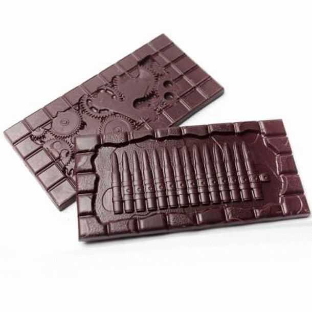 В городе Миасс Челябинской области наладили выпуск странного шоколада с необычным оформлением. Покупателям предлагают два варианта сладкой плитки – украшенной изображением пуль либо шестеренок.