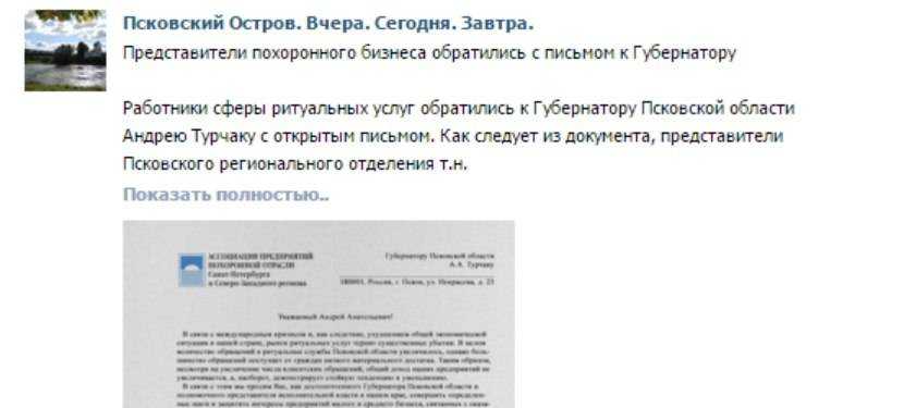 «Общий доход наших предприятий … демонстрирует стойкую тенденцию к уменьшению», - с такой жалобой некая «Ассоциация предприятий похоронной отрасли Санкт-Петербурга и Северо-Западного региона» обратилась к губернатору Псковской области.