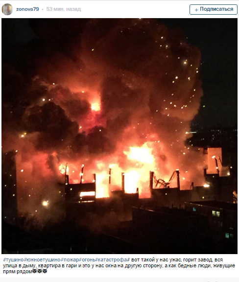 Сегодня, 10 октября, на северо-западе Москвы по улице Новопоселковая, д.6, Тушинский машиностроительный завод и близлежащие здания охвачены гигантским пламенем.