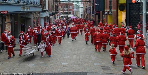 На улицы Лондона вышли сотни людей в костюмах Санта-Клауса, оленей и эльфов, и устроили массовый праздник в честь приближения Рождества.