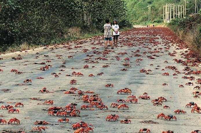 Красные крабы перемещаются из леса к океану с единственной целью – дать новое потомство, то есть обеспечить рождество новой жизни. Их так много, что они перекрывают все дороги и трассы, поэтому власти острова в это время приостанавливают движение автотранспорта, к тому же на самых горячих участках, где невозможно это сделать, здесь давно уже построены специальные мостики, перелазы и тоннели, дабы короткохвостые раки могли мигрировать к воде, минуя опасные магистрали дорог.