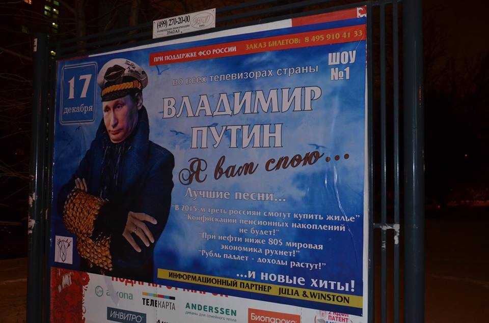 Перед пресс-конференцией российского президента Владимира Путина в Москве развесили постеры, на которых анонсировали «концерт» главы государства. Имелось в виду то, что выступление лидера России – это фальш, как пение «под фанеру».